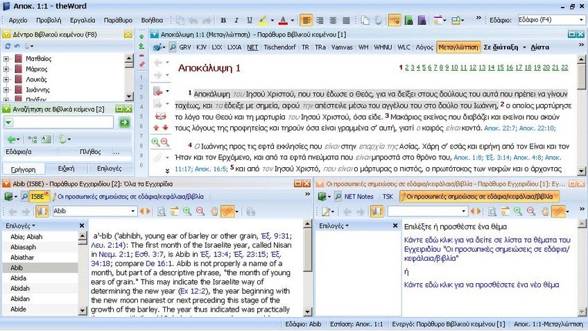 Αφού εγκαταστήσετε το πρόγραμμα, (Το οποίο είναι πλήρως εξελληνισμένο) θα μπορέσετε να το εμπλουτίσετε με αρκετά add-ons(πρόσθετα) από διάφορες μεταφράσεις της Καινής αλλά και της Παλιάς Διαθήκης, τα οποία θα τα βρείτε στο site του Δημιουργού.